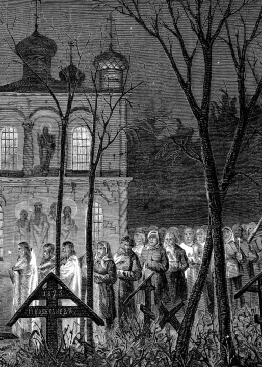 Но вот в одном конце равнины раздалось гудение полночного колокола; навстречу ему, с противоположного конца, понеслось другое, за ним — третье, четвертое. На темном фоне ночи вырезались горящие шпили церквей, и окрестность вдруг ожила. По дороге потянулись вереницы деревенского люда. Впереди шли люди серые, замученные жизнью и нищетою, люди с истерзанными сердцами и с поникшими долу головами. Они несли в храм свое смирение и свои воздыхания; это было все, что они могли дать воскресшему Богу. За ними, поодаль, следовали в праздничных одеждах деревенские богатеи, кулаки и прочие властелины деревни. Они весело гуторили меж собою и несли в храм свои мечтания о предстоящем недельном ликовании. Но скоро толпы народные утонули в глубине проселка; замер в воздухе последний удар призывного благовеста, и все опять торжественно смолкло.