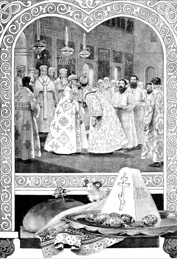 Воевода обнял его и трижды лобызал братски… А вся церковь в один голос пела «…друг друга обымем». И пошел воевода по всей церкви, и христосовался со своими вчерашними колодниками, а те, не помня зла, ответно говорили ему: