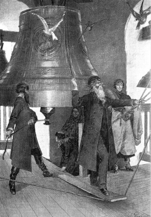 Колокола. Странная система веревок и деревянных рычагов-педалей, порою повисших совсем в воздухе, почти наружу. Есть колокола совсем маленькие: это дети; есть побольше — юноши и молодые люди, незрелые, с голосами громкими и протяжными: в них так же лестно позвонить мальчугану, как, например, едучи на извозчике, посидеть на козлах и хоть с минуту подержать вожжи. Но вот и Он, самый главный, самый громадный колокол собора; говорят, что он по величине и по весу второй в Москве, после Ивановского, и потому он — гордость всей Пресни.