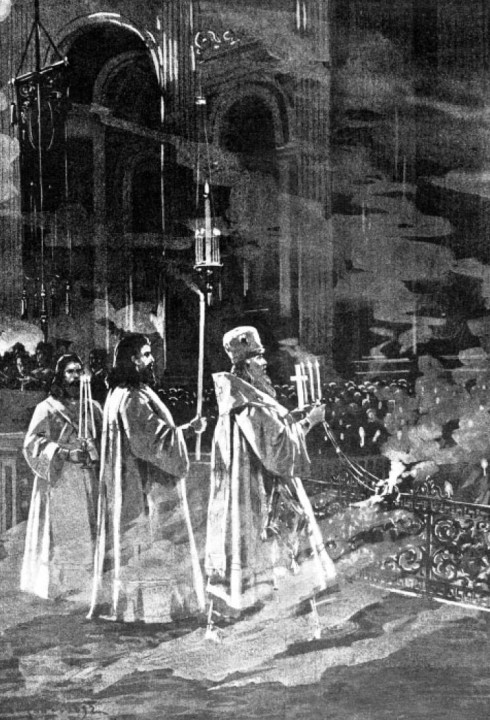 Ни одна лампада, ни одна свеча не теплится по всему храму. Изредка прорвется в полумрачное пространство здания веселый солнечный луч. Задолго до прибытия патриарха уже раздается глухой, едва сдерживаемый ропот толпы, наэлектризованной нетерпеливым ожиданием. Но в эту минуту все смолкает, все замирает. В народной массе ни единый не осмелится теперь открыть рта, пошевелить пальцем. Тишина гробовая.
