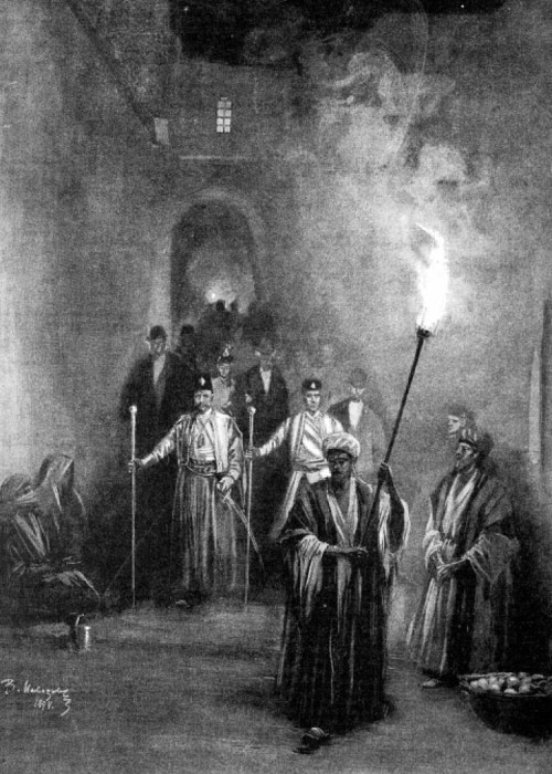 Задолго до двух часов дня во храме, вмещающем в себя двенадцать тысяч человек и более, давка страшная; народная толпа, в которой преобладает арабский элемент, до такой степени компактна, что невозможно ни малейшее передвижение. Безчисленные галереи верхних этажей, оконные углубления, ниши всякого рода, даже карнизы — все это кишмя кишит народом.
