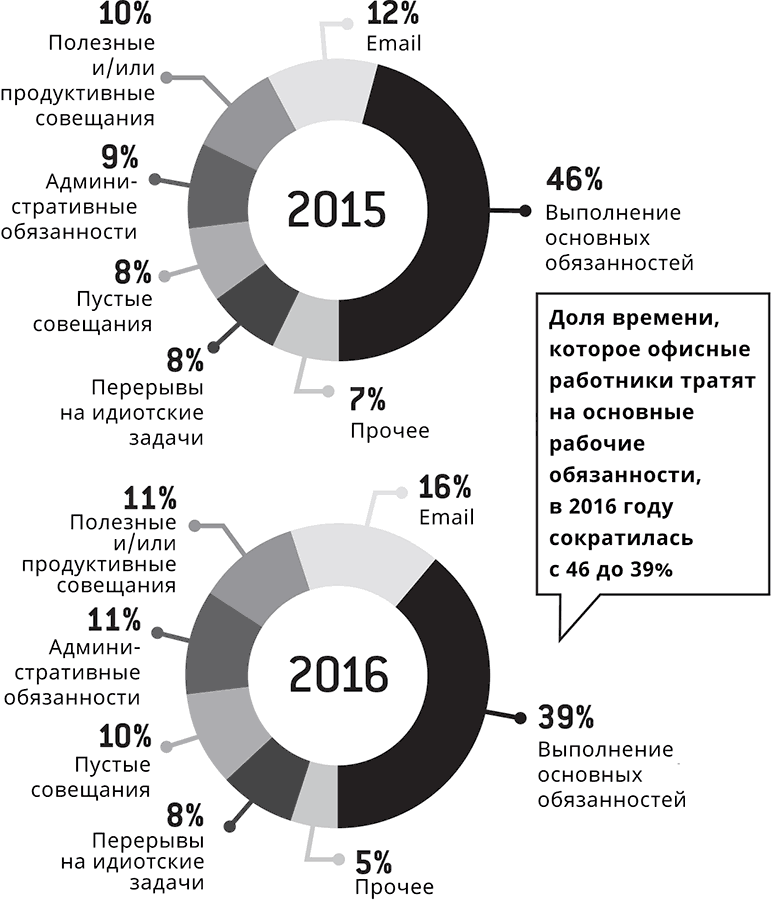 Корпорации проводят безжалостные сокращения, но оптимизация и повышение норм выработки неизменно приходятся на тех людей, которые действительно что-то делают, перемещают, чинят или поддерживают в порядке. Благодаря какой-то странной алхимии, которую никто не может объяснить, количество профессиональных бумагомарак непреклонно продолжает расти. При этом всё больше и больше работников выясняют (и тут не так много отличий от их советских коллег), что они работают сорок или даже пятьдесят часов в неделю на бумаге, но фактическим трудом заняты лишь пятнадцать часов, как и предсказывал Кейнс. Оставшееся время тратится на организацию или посещение мотивационных семинаров, обновление аккаунтов на Facebook или скачивание сериалов.