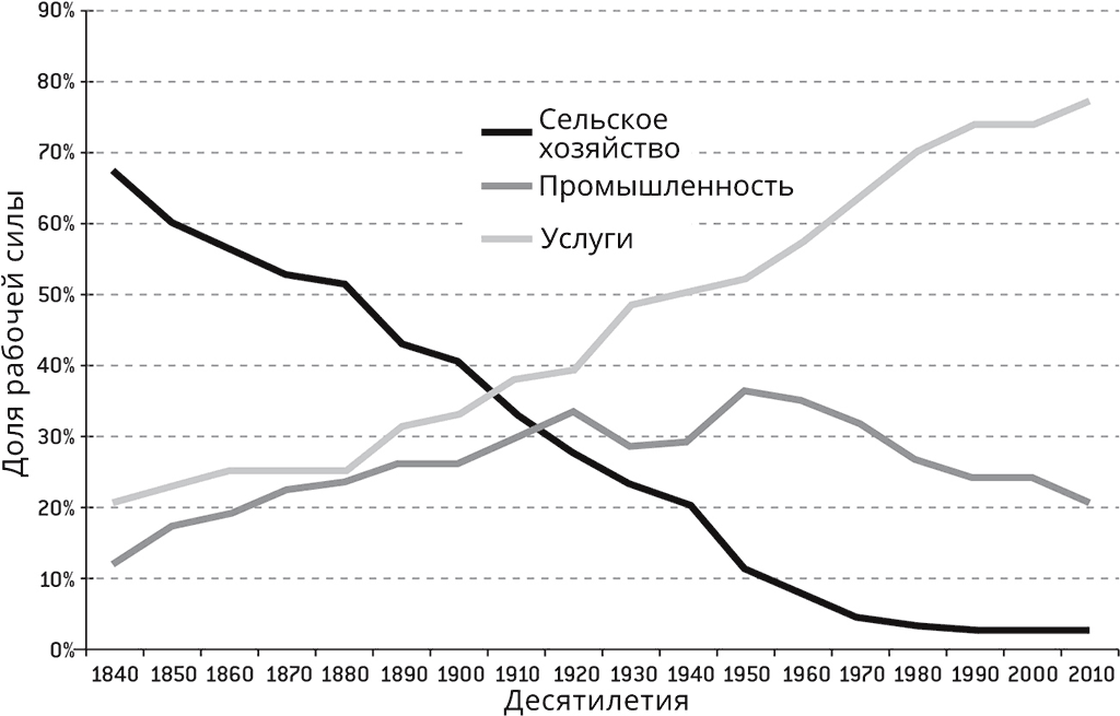 Так что это тогда за новые должности? Недавний отчет, который сравнивает занятость в США между 1910 и 2000 годами, дает довольно ясную картину происходящего (отмечу, что это очень похоже и на ситуацию в Великобритании). На протяжении последнего века резко снизилось число работников, занятых в качестве домашней прислуги, в промышленном производстве и в сельскохозяйственном секторе. В то же время количество «профессиональных работников, менеджеров, офисных служащих, продажников и занятых в сфере услуг» увеличилось втрое: «с одной четверти до трех четвертей общего числа занятых». Иными словами, производительный труд, как и было предсказано, в значительной степени оказался автоматизирован. (Даже если посчитать промышленных рабочих во всем мире, включая массы трудящихся в Индии и Китае, всё равно их доля в населении Земли далеко не так высока, как была раньше.)