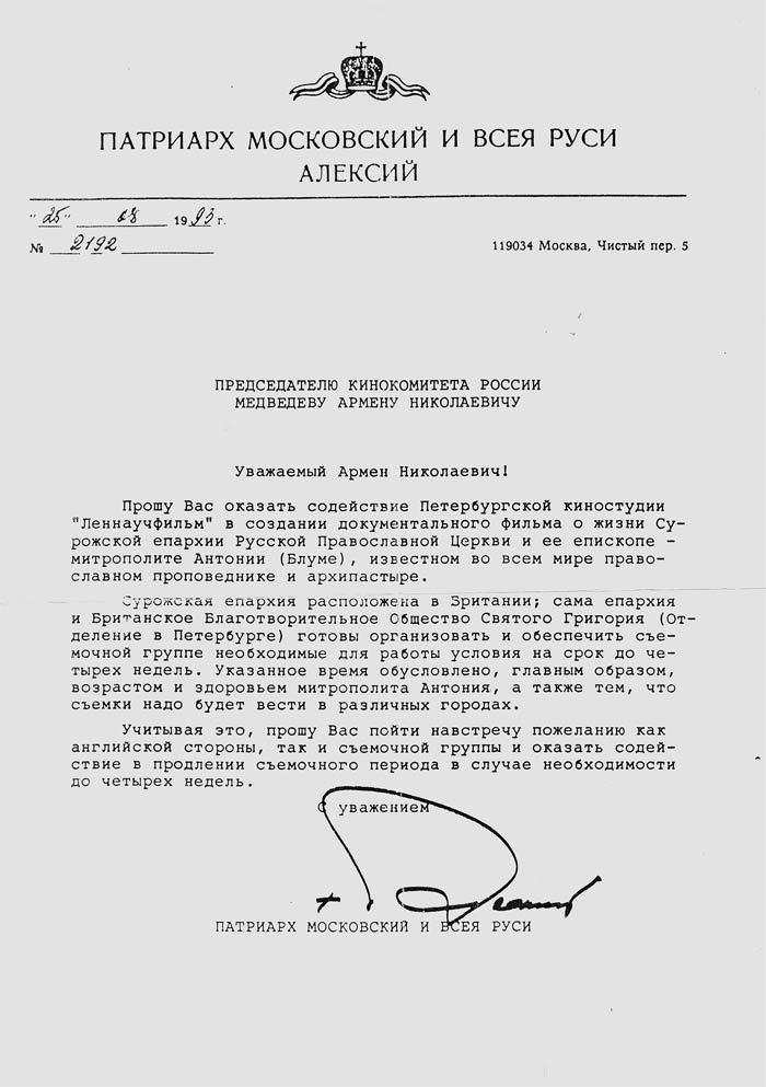В тот майский день 1989 года у меня и в мыслях не было, что через четыре года я сниму свой первый фильм о Владыке Антонии и назову его «Встреча». Но начало фильму было положено здесь, в Эффингаме, где я познакомилась со многими будущими его героями. Здесь завязались дружеские отношения, без которых невозможно было бы снять его. Люди, сидевшие в зале, будут возить съемочную группу по Англии, предоставлять кров, кормить и помогать во всем, чтобы запланированная Госкино пятидневная командировка продлилась пять недель, за которые мы сняли двадцать один час материала.
