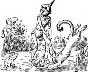 Пока друзья сидели и смотрели по сторонам, невдалеке заколыхалась трава, и на лужайку выскочил желтый дикий кот. Оскалив острые зубы и прижав уши к голове, он гнался за добычей. Железный Дровосек вскочил и увидел бегущую серую полевую мышь. Кот занес над ней когтистую лапу, и мышка, жалобно пискнув, закрыла глаза; но Железный Дровосек сжалился над беззащитным созданием и отрубил голову дикому коту. Мышка открыла глаза и увидела, что враг мертв. Она сказала Железному Дровосеку пискливым голосом:
