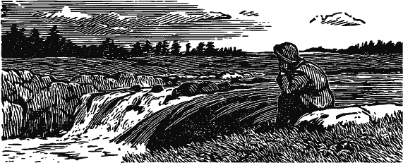 Мы спускались ручьем все ниже и ниже, пока он не стал речкой в спокойной долине. Тут мы сели в карбас, и вода нас понесла. Отец правил и подгребал. Я с ружьем наготове сидел на носу. Вижу, из заводи выплыла впереди нас пара лебедей.