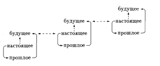 Итак, с каждым новым шагом в поступательном движении истории меняется как настоящее, так и прошлое и вместе с тем определяются дальнейшие пути исторического развития. Исторический процесс в своей элементарной фазе предстает тогда как последовательность рекурсивных ходов: от настоящего к прошлому, а от прошлого к будущему и т. д. и т. п.[10]. Схематически этот процесс может быть изображен следующим образом (сплошная стрелка относится к плану сознания, а пунктирная стрелка передает движение времени):