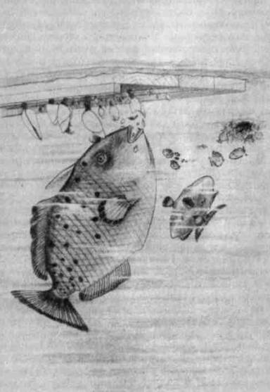 РЫБАКИ ПОДРУЛИВАЮТ ПРЯМО КО ВХОДУ МОЕЙ «Уточки». Перебрасываю к ним мешок со снаряжением. Надежные руки подхватывают меня, я вскарабкиваюсь на борт и усаживаюсь на дно лодки, где лежат десятки дорад и несколько барракуд. Узнаю своих собачек. Здесь находится и та дорада, которую я однажды выдернул из моря — «Ну что, глупая рыба, допрыгалась?» — просто, чтобы отпугнуть ее. Здесь и та, которая перекусила мою рыболовную лесу впереди проволочного поводка. Здесь же и милая самочка, которая, бывало, застенчиво терлась о плот, всегда чуть правее того места, куда я целил. Но изумрудных старейшин не видно нигде.