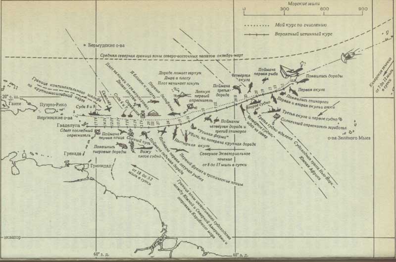 Все что здесь рассказано, происходило в действительности. С тех пор прошло уже три года. Тогда какие-то вещи казались мне важнее и сейчас уже не производят такого яркого впечатления, как прежде. Например, одной из наиболее могущественных сил, с которыми сталкивается мореплаватель, равно как и другие люди, чья деятельность непосредственно связана с окружающей средой — фермеры, водолазы, альпинисты, — является погода. На суше мы и не замечаем циклонов, хотя они приносят проливные дожди и ветер, скорость которого достигает 35 миль в час. Для нас ничего не стоит, накинув плащ, добежать до автомобиля, а из него — до дверей конторы Но в открытом море капризы погоды чреваты Серьезными последствиями. В Атлантике ветер со скоростью 35 узлов вызывает опасное волнение на мелководье или в местах, где— проходят сильные течения. Мне приходилось видеть вздымающиеся за кормой громады высотой 25 футов. Такие волны небезопасны даже для таких сравнительно крупных судов, как траулеры. Встреча с блуждающей волной-убийцей во время такого шторма означает неизбежную гибель. Малейшее усиление ветра немедленно сказывается на судне: палуба уходит из-под ног температура падает, из чашки выплескивается кофе. Не менее ощутимо наступление штиля: обвисшие паруса начинают хлопать, дергается такелаж, температура подскакивает с 10 до 35 °С. Чем меньше судно, тем острее ощущаются на нем перемены погоды. К сожалению, сейчас я уже не могу во всех подробностях припомнить капризы погоды, которые мне пришлось испытать на плоту.