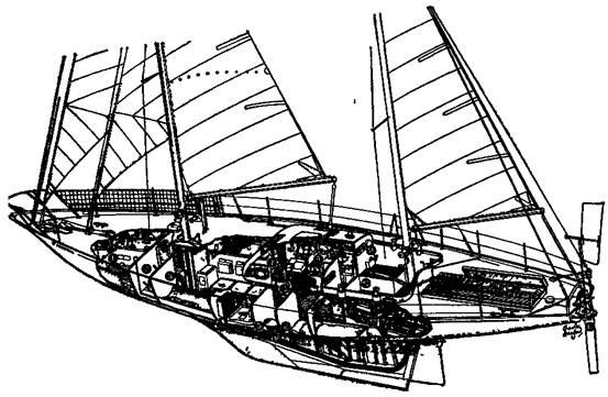 1 — носовая каюта (койка, откидная койка, рундук для парусов); 2 — гальюн (умывальник, ватерклозет, вешалки для платья, кладовая); 3 — салон (2 койки, шесть сидений, откидной стол); 4 — штурманский стол для карт и радиотелефон (не показав); 5 — гальюн, вешалка для дождевого платья; 6 — штурманская койка (с инструментами над ней); 7 — керосиновая печь;8 — подвесное кресло и столик; 9 — камбуз; 10 — камбузная мойка для посуды и посудный шкаф; 11 — труба обогревателя; 12 — кокпит (судовые инструменты, рулевое и машинное управление, гнезда для рукояток к лебедкам); 13 — мотор и генератор; 14 — тузик; 15 — автоматическое рулевое устройство Хэслера; 16 — цистерна для пресной воды и горючего.