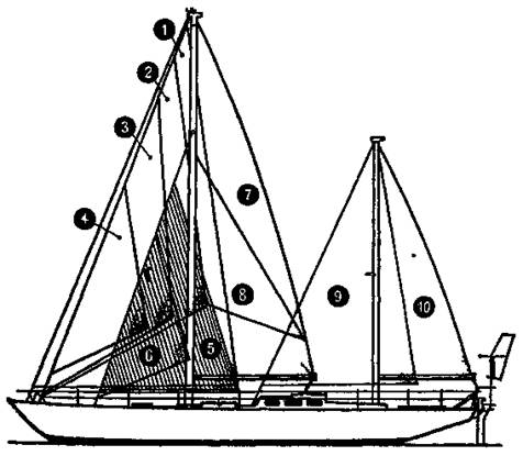 1 — большой генуэзский стаксель (600 кв. футов); 2 — штилевой рабочий кливер (300 кв. футов); 3 — рабочий кливер (187 кв. футов); 4 — штормовой кливер (107 кв. футов); 5 — генуэзский стаксель (188 кв. футов); 6 — штормовой стаксель (95 кв. футов); 7 — грот (289 кв. футов); 8 — трисель (144 кв. фута); 9 — бизань-стаксель (350кв. футов);10 — бизань (143 кв. фута).