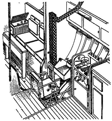 На рисунке рядом с камбузом показано подвесное кресло со столиком. С другой стороны кресла — керосиновый обогреватель с обрешеченным стояком и трубой, которые используются для сушки одежды.