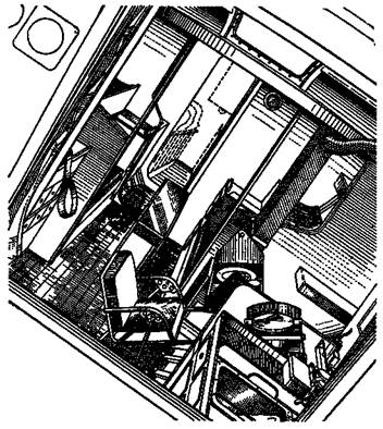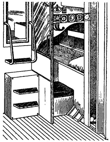 На рисунке показаны изголовье койки, панель с инструментами, сиденье, служащее одновременно ящиком для обуви. Складывающаяся дверь ведет в гальюн, на полу которого видна электропомпа. Панель со ступеньками трапа обрывается, открывая доступ к мотору. Между трапом и койкой — переборка, застекленная наполовину.