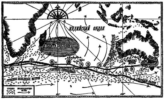 Провести яхту без захода в промежуточные порты от Плимута до Сиднея — сложнейшая задача. Можно ли ее решить? По предварительному, несколько поспешному подсчету мне предстояло покрыть расстояние 13750 миль, если держаться пути, которым когда-то шли клипера, быстроходные суда с прямым парусным вооружением. Несколько столетий 10 тысяч судов занимались отбором лучшего варианта трассы, и этот путь был признан самым скоростным. Когда я позже тщательно и не торопясь измерил расстояние, оно оказалось равным 14100 милям. За какое рекордно короткое время мог я надеяться преодолеть этот путь? В 1964 году на вторых одиночных трансатлантических гонках меня обошел лейтенант французского флота Эрик Табарли на судне, специально построенном для состязаний; его скорость в плавании через Атлантический океан с востока на запад составила 105,5 мили в сутки. После гонок, на обратном пути, я захватил с собой своего сына Гилса, и мы делали в среднем 126 миль в сутки. Я полагал, что путь клиперов по своим условиям ближе к плаваниям в атлантических водах с запада на восток, чем в обратном направлении. Правда, рейс в 14 000 миль нельзя сравнивать с 3200 милями трансатлантического плавания. Все же я полагал, что средняя скорость 126 миль для меня прекрасная цель, за которую, во всяком случае, можно было бороться с надеждой выиграть.