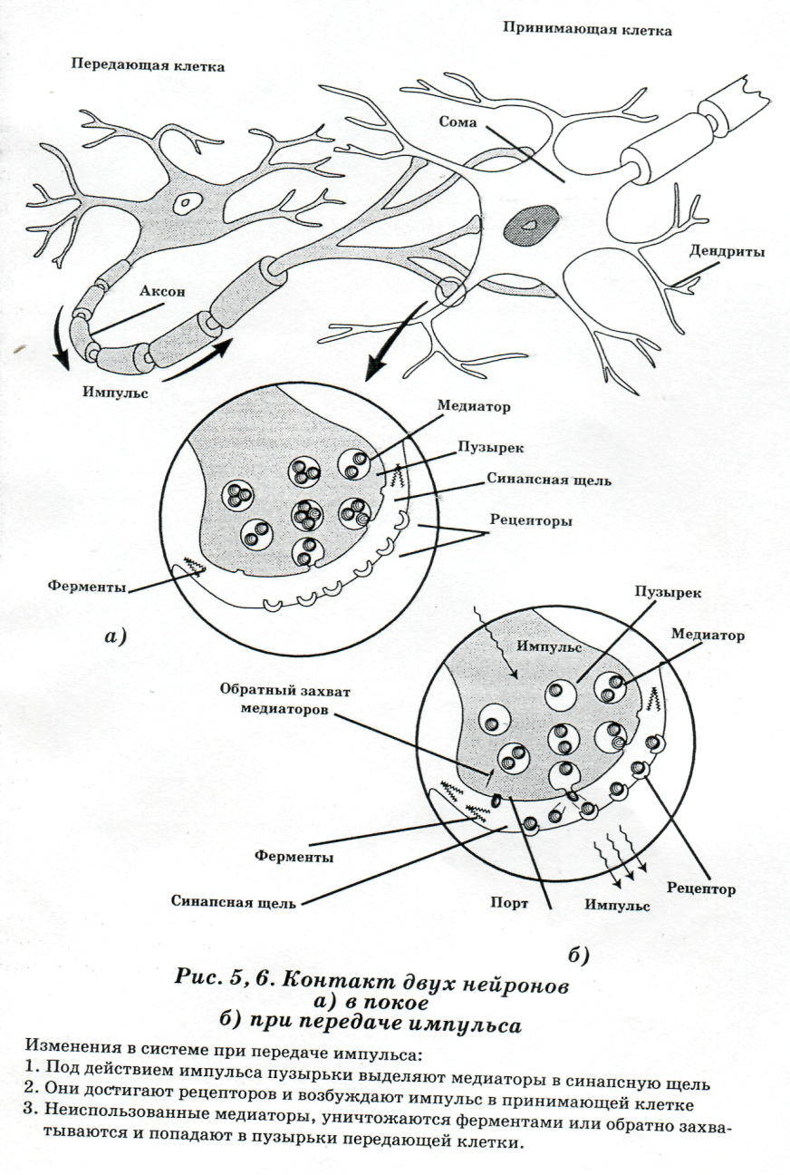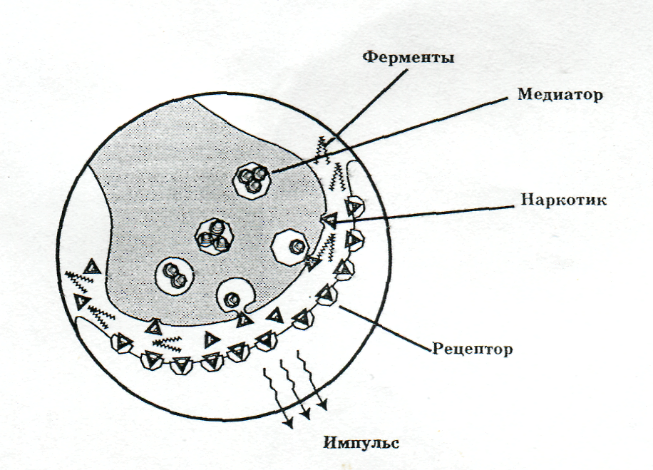 Для того чтобы понять, как действуют наркотические вещества, нужно знать строение нервной системы. Головной мозг состоит из 14-16 миллиардов нервных клеток (нейронов). Нервные клетки похожи на другие клетки организма, но имеют одну важную особенность, они умеют общаться друг с другом. Один возбужденный нейрон способен передавать импульс другим нейронам. С позиции физиологии вся многообразная психическая деятельность человека сводится к передаче нервных импульсов от одних нейронов к другим. В здоровом мозге процессы возбуждения и торможения сбалансированы. Передача импульсов осуществляется электрохимическим путем. Возбужденный нейрон по длинному отростку, называемому аксоном, проводит электрический импульс. Аксон заканчивается синапсом, местом, где электрический импульс от одного нейрона передается другому с помощью химической реакции. Поступивший электрический сигнал обеспечивает выделение в синапсе химических веществ – нейромедиаторов, которые возбуждают другой нейрон. Все наркотические вещества действуют на уровне синапсов, стимулируя выделение тех или иных нейромедиаторов, или подавляя их разрушение и обратный захват. Наркотики с психостимулирующим действием повышают концентрацию нейромедиаторов возбуждающего действия. Например, кокаин повышает уровень моноаминов в синапсах блокируя их обратный захват. Алкоголь вызывает дисбаланс между стимулирующими и тормозными медиаторными системами, прежде всего, повышая активность нейромедиаторов тормозного типа, таких как ГАМК (гамма-аминомасляная кислота) и глутамат. Поэтому алкоголь относят к наркотикам – депрессантам, психоактивным веществам, подавляющим психику.
