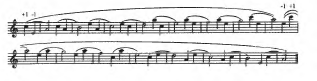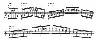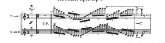 Как исключение хроматическая гамма встречается уже в написанной в 1984 году «Wallfahrtslied» («Песни пилигрима»), где ее тонально связывает tintinnabuli-трезвучие e-moll. В написанной почти двадцатью годами позже «Пассакалии для скрипки и фортепиано» (2003) хроматические восходящие терции в верхних голосах объединяются с басом, спускающимся по целым тонам вниз. Эти крайние голоса, которые, будучи взятыми сами по себе, не связываются ни с каким основным тоном, центрируют звучащие одновременно квинты а1 — е2, равно как и введенные аккорды A-dur и a-moll, складывающиеся в определенные моменты пересечения двух расходящихся линий (нотный пример 23). Таким образом, в этой пассакалии нет никаких жанрово обусловленных повторов темы. Скорее, здесь возвращается одна и та же последовательность созвучий, которая в противоположно расходящихся гаммах растягивается на несколько октав; наконец, она появляется в ракоходе, завершая процесс формообразования: в строго структурированном строении произведения традиционная форма пассакалии снимается в той же мере, что и противоположность тональности и атональности.