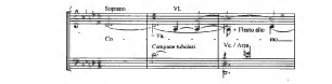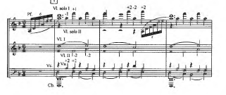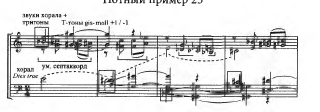 В сравнении с более ранними коллажными работами, роль цитат, впрочем, полностью меняется. Ранее цитата, контрастировавшая с атональным звуковым окружением, полностью выпадала из контекста, а потому легко распознавалась в качестве таковой. В данном же случае цитируемая секвенция, являясь основополагающим мелодическим голосом, не заданным текстом, а уже существующим — подобно cantus prius factus средневековой полифонии — полностью растворяется в стиле tintinnabuli (нотный пример 25). Звуки хорала (в cis-moll дорийском) поручены альту; медные духовые инструменты и солирующее фортепиано дополняют его в регулярно меняющихся регистрах до двузвучий с тритонами внизу и ведут к gis-тоll`ным тонам-tintinnabuli (+1 и -1 к звукам тритона). Движение восьмыми высоких струнных дополняет уменьшенный септаккорд вторым тритоном и при этом вводит между двумя тритонами интервалы tintinnabuli трезвучия gis-moll (тт. 3 и 4). Это параллельное и последовательное соединение уменьшенных септаккордов и трезвучий-tintinnabuli создает резкий звуковой образ, определяемый постоянно присутствующим тритоном и тем самым соотносящийся не только с мелодическим движением, но и с содержанием секвенции (Dies іrае = День гнева), повествующей об ужасах Страшного суда.