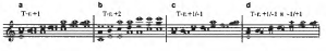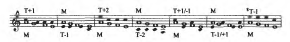 Для формул Т-голоса будем применять знаки + или - (означает верхнее или нижнее положение Т-голоса по отношению к М-голосу) и арабские цифры (1 — ближайший тон трезвучия по отношению к М-тону, 2 — выбор следующего тона, расположенного через один тон, и 3 — через два тона). Таковы формулы: Т+1 или Т-1 для верхних или нижних ближайших Т-тонов, в условно тесном расположении, Т+2 или Т-2 для тонов в условно широком расположении, Т+3 или Т-3 для выбора самого дальнего в пределах октавы Т-тона, Т+1/-1 или Т-1/+1 для чередующихся Т-тонов.