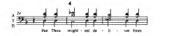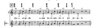 Здесь мелодические линии баса и тенора созданы согласно различным правилам озвучивания текста. Бас удаляется от тона речитации as (f-moll 3) только на ударных слогах, а именно: на секунду вниз — в двусложных словах (quan-do), на терцию вниз — в трехсложных (da-van-ti, соп-ses-so), на кварту вниз — в четырехсложных и т. д.