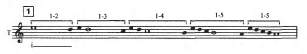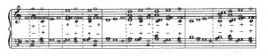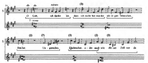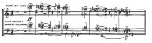 Далее каждый отдельный звук по-прежнему входит в состав первичных композиционных элементов — трезвучий и гамм, однако общая картина дифференцируется благодаря тому, что гаммы даются не в основном, а в преобразованном виде. Это касается, например, партии сопрано эпизода «Молитва фарисея» из произведения «Zwei Beter» («Двое молящихся») для женского хора a cappella (нотный пример 19):