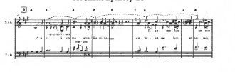 В мотете «Salve Regina» движение на большом участке определяет последовательность трехзвучных аккордов. Созвучия, как правило, связываются друг с другом на основе общего тона (или двух тонов). Сначала два нижних звука движутся на ступень вниз и обратно, а затем, словно симметрично, два верхних звука — на ступень вверх и обратно, что в совокупности образует каденцию по тональности e-moll с обратной последовательностью функций: минорная субдоминанта (s) — минорная доминанта (d) (t d t s t s T s). Между тем, эта каденция завершается не одноименной мажорной тоникой (Т вместо t), а минорной субдоминантой (s). Таким образом, предшествующее ей трезвучие E-dur (Т) воспринимается как типичная в минорной каденции мажорная доминанта к а-moll (T=D). Вторая фраза начинается как ракоход первой, однако до четвертого аккорда доходит только средний голос: вместе с достигнутым таким образом секстаккордом C-dur (в e-moll VI = противоположность тонике t) пространство каденции простирается до тональности G-dur, параллельной основной тональности e-moll. В конце фразы в верхних голосах курсирует та же самая пара терций, что и в первой фразе (g — h и а — с), однако в нижнем голосе здесь находится звук d, который возвращает эти терции в тональность G-dur. Благодаря перемещению всех трех звуков повторение двух фраз возвращается, наконец, к двум первым созвучиям и тем самым — назад к e-moll (нотный пример 21). Посредством намеченной и опровергнутой симметрии, чередования звуков g и gis, а также мышления в линеарных поступенных движениях басового голоса как несущего элемента гармонической структуры, кажущаяся такой простой последовательность созвучий контрастирует с привычной каденционной моделью, из элементов которой она состоит.