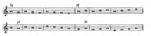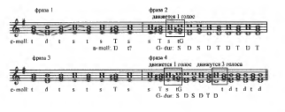Будем исходить из простой схемы, где М-голос — нисходящий тетрахорд в а-эолийском ладу, Т-голос — последование тонов а-тоll-ного трезвучия. Запишем белыми нотами М-голос, черными — Т-голос (см. схему 1).