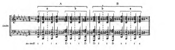 Еще более простой и целиком определяемой симметрией является последовательность трех групп аккордов струнных в разделе «Solitudine — stato d’animo» из «Lamentate» для фортепиано и оркестра (нотный пример 22). Три основные ступени тональности as-moll (і — іv — V) упорядочиваются симметрично различными способами: сочетание s — t дополнено зеркально симметричным t — s, затем следует обращение квартового шага с оставшейся неизменной тоникой как зеркальной осью (D— t и t — D). Наконец, вторая половина (как ракоход первой) возвращается к исходному аккорду des-moll. В условиях тональной зеркальной симметрии простейшие функциональные последовательности появляются всякий раз с новой стороны и объединяются в восьмитактовый период квадратной структуры: второй такт объединяется с первым, образуя двухтактовую фразу (а), вторая фраза (b) объединяется с первой, образуя предложение из четырех тактов (А), которое затем уравновешивает второй четырехтакт (В).