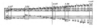 Дополнительные полутоновые шаги в М-голосе, возникающие благодаря альтерации отдельных ступеней лада (Tonleiter), характеризуют уже звуковой мир «Fratres» (1977). Трезвучие-tintinnabuli a-moll и квинтовый бурдон а — е соединяются в этом произведении с лежащей в основании М-голоса гаммой d — е —f— g — а — b — cis — d[88]. Взятая сама по себе, эта гамма представляет собой гармонический d-moll с двумя полутоновыми шагами и одной увеличенной секундой. Однако и трезвучие tintinnabuli, и бурдон утверждают в качестве тонального центра звук а. Таким образом, здесь возникают две возможности: понять все произведение как доминантовую подготовку тоники d-moll, которая так и не появится, либо истолковать только что упомянутую гамму как фригийскую от а с повышенной третьей ступенью cis (она известна также как фригийский мажор, испанский или еврейский лад (Tonleiter)); при этом cis чередуется с основным тоном с трезвучия-tintinnabuli, создавая тем самым гармонически неустойчивое положение (ладо-гармоническую неопределенность. — Прим. ред.)[89].