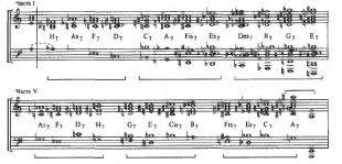В «In principle» для хора и оркестра, написанном на первые 14 стихов Евангелия от Иоанна, уменьшенный септаккорд сначала действует на заднем плане: в первой части он регулирует последовательность двенадцати малых мажорных секундаккордов, которые в качестве инструментальных реплик, следующих одна за другой на всех двенадцати ступенях хроматической тональности, противостоят упорствующей силе постоянно повторяющегося трезвучия a-moll у хора. Расположенные в басу септимы этих аккордов образуют три хроматически смещенных уменьшенных септаккорда и тем самым — в сумме — дают все двенадцать тонов (нотный пример 27). В противоположность басу, верхний голос поднимается вверх, образуя воронкообразное фактурное расширение.