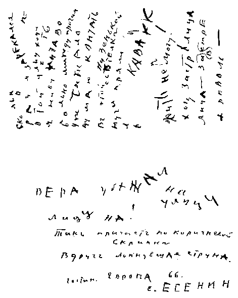 Есенин. (Благослови меня, мой друг, на благородный труд. Хочу писать «Пророка»,* в котором буду клеймить позором слепую, увязшую в пороках толпу. Если в твоей душе хранятся еще помимо какие мысли, то прошу тебя, дай мне их как для необходимого материала. Укажи, каким путем идти, чтобы не зачернить себя в этом греховном сонме. Отныне даю тебе клятву. Буду следовать своему «Поэту».* Пусть меня ждут унижения, презрения и ссылки. Я буду тверд, как будет мой пророк, выпивающий бокал, полный яда, за святую правду с сознанием благородного подвига.)