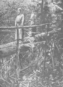 — Покажем вам наш лес, — сказал о. Никифор. Мы спустились немного вниз и пошли некрутым косогором, без тропы, прямо по лесу, по мягким прошлогодним листьям. Дошли до маленькой кельи о. Никодима. Посидели около нее. И снова вошли в лес. Спустились еще ниже, до глубокого, глухо заросшего оврага. Через овраг перекинут «мост»: громадная пихта с густыми, теперь полусгнившими ветвями.