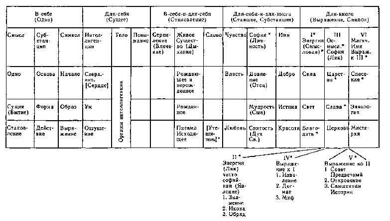 Так связывается воедино общая стихия Магического Имени со своей 1. смысловой стороной (Сила, Свет, Благодать), 2. софийной стихией (Знамение, Икона, Обряд), 3. осмысленно–софийной (Царство, Слава, Церковь), 4. выразительно–смысловой (Изволение, Догмат, Миф), 5. выразительно–софийной (Совет Предвечный, Откровение, Священная История) и 6. выразительной умно–софий–ной (Спасение, Молитва, Таинство).