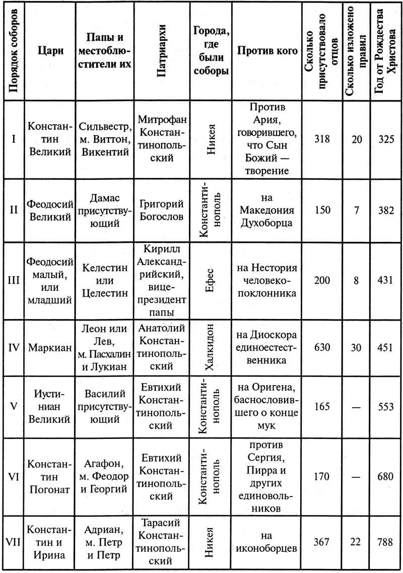 Ты желал иметь краткое понятие о Вселенских Соборах Святых Отцов. Вот при сем тебе сокращенное и достаточное изображение (в таблице) всего нужнейшего для знания о них, а правила их читай в Кормчей.