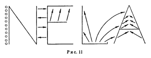 Сейчас появилось математическое орудие такого рода, что мы можем понять такое явление, в котором каждая часть взаимодействует в пространстве и во времени с всеми прочими. (Примеры: даются 2 (примера), первый будет говорить о пространстве, но то же самое о времени.) Два заряженных электричеством тела как будто (задают) направление силовых линий. Силовые линии исходят из некоторого единичного заряда, из электрона на поверхность одного тела, заряд обратного (знака) на другом теле. От каждого электрона исходит одна такая нить. Как же расположатся эти нити? Они расположатся так, как расположены электроны, а электроны —так, как расположены эти силовые нити. Кроме наличия зарядов, эти нити взаимодействуют между собою. Они расталкиваются, каждая стремится сократиться и расшириться. Следовательно, для того, чтобы определить, как расположатся силовые нити, я должен знать, как расположены большие нити. Но для того чтобы знать, как расположены большие, я должен знать, как расположено тело. Я еще вернусь к этому.