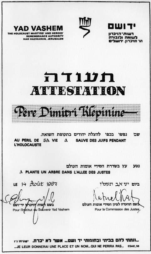 Аттестат института «Яд Вашем» на имя священника Димитрия Клепинина за спасение евреев с риском для собственной жизни
