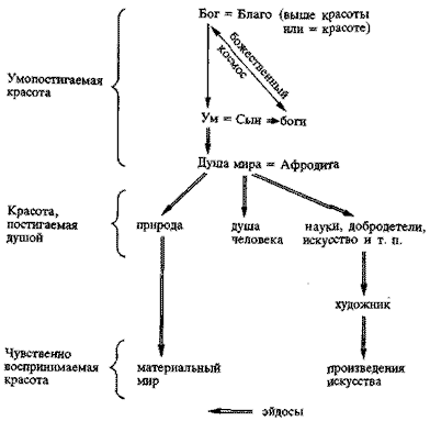 Таким образом, у Плотина вырисовывается стройная иерархия красоты, состоящая из трех ступеней. Первая, и высшая, ступень - это умопостигаемая красота. Источником ее является Бог (=высшему благу), а главными носителями последовательно выступают Ум и Душа мира, которая, в свою очередь, дает начало следующей ступени красоты - постигаемой душой (человека). На этой ступени находится идеальная красота природы, красота души человека и красота добродетелей, наук, искусства. Нижнюю ступень иерархии занимает чувственно воспринимаемая красота, к которой Плотин относит реальную красоту мира и красоту произведений искусства. Передача красоты с высших ступеней иерархии на низшие производится с помощью эйдосов, исходящих от Ума, и имеет общую тенденцию к увеличению степени материализации красоты, ее огрублению. На эту иерархию, так или иначе ее переосмысливая, во многом ориентировалась средневековая эстетика и художественная культура.