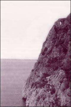 Юго-западный утесь Каруліи, гдѣ отшельническія келліи, точно ласточкины гнезда, построены въ большинствѣ русскими исихастами. Это видъ изъ терраски Старца Ѳеодосія на западъ. Туда пробираются при помощи цѣпей.