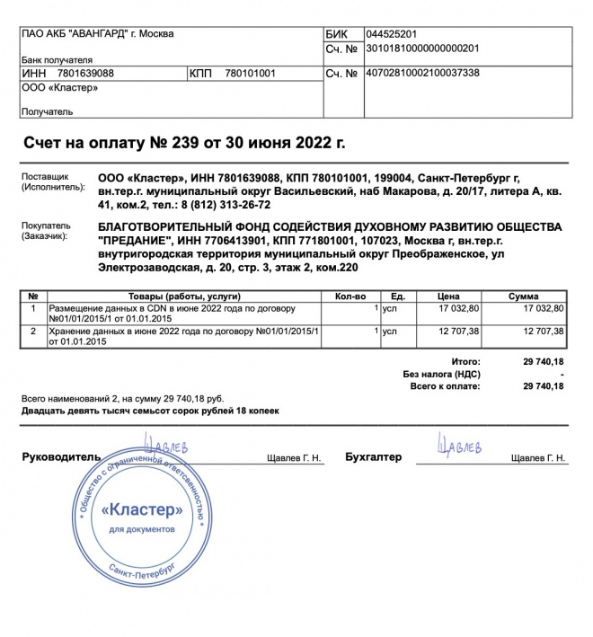 Оплачен счет за размещение материалов медиатеки в "облачном сервисе" в июне 2022 г.