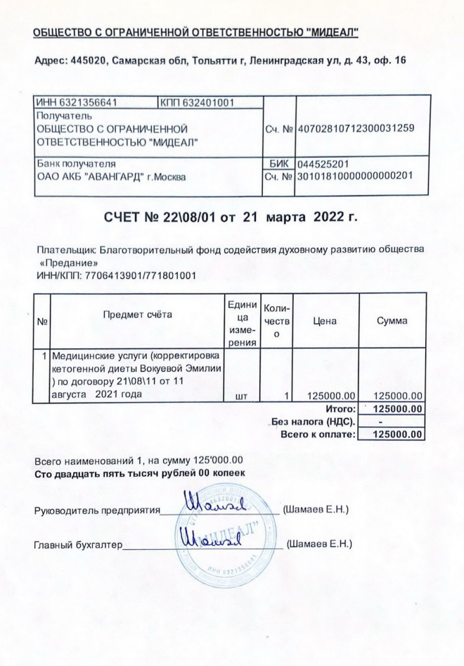 Оплачен счет за проведение корректировки кетогенной диеты Эмилии Вокуевой в клинике "Мидеал"