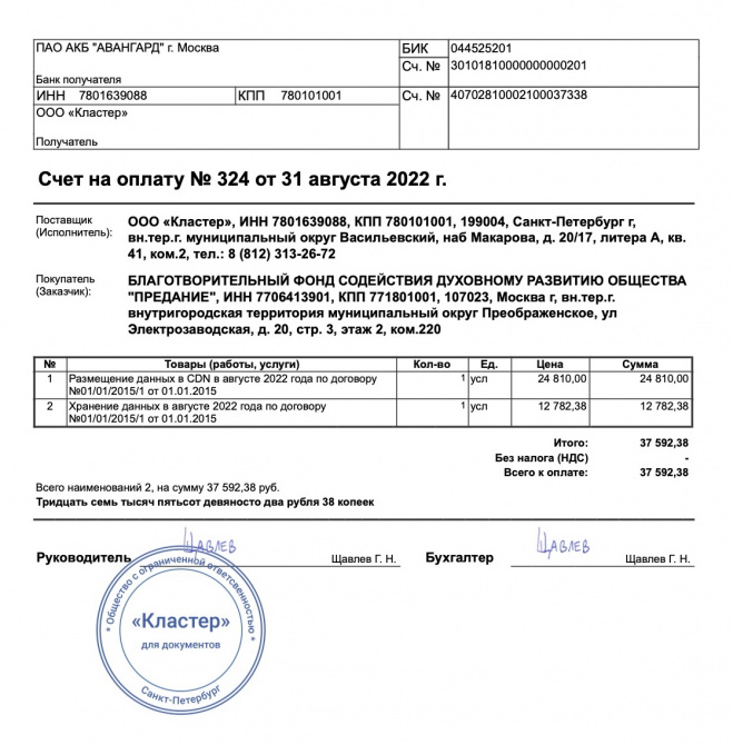 Оплачен счет за размещение материалов медиатеки в "облачном сервисе" в августе 2022 г.
