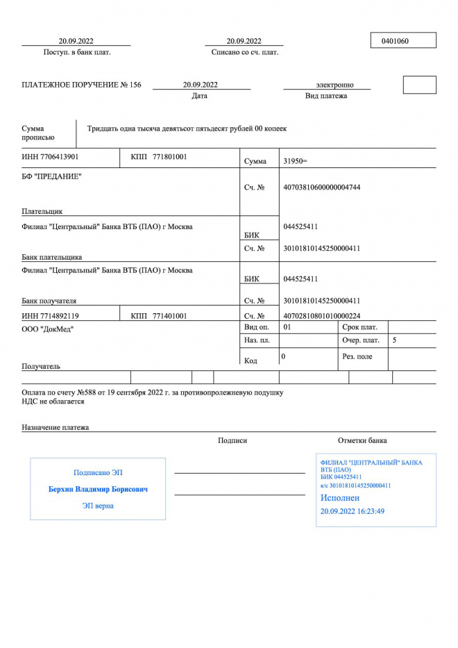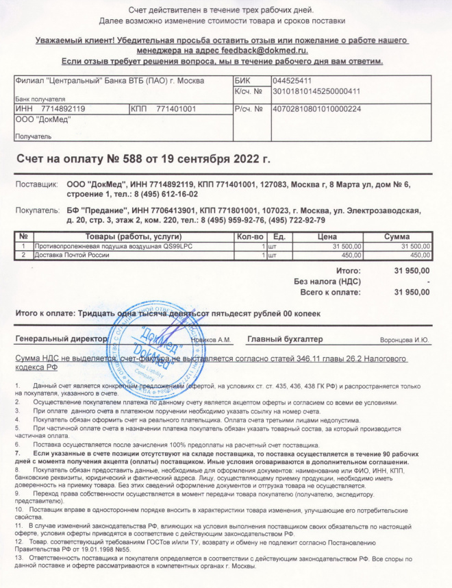 Пожертвование согласно ст.582 ГК РФ. Без налога (НДС)