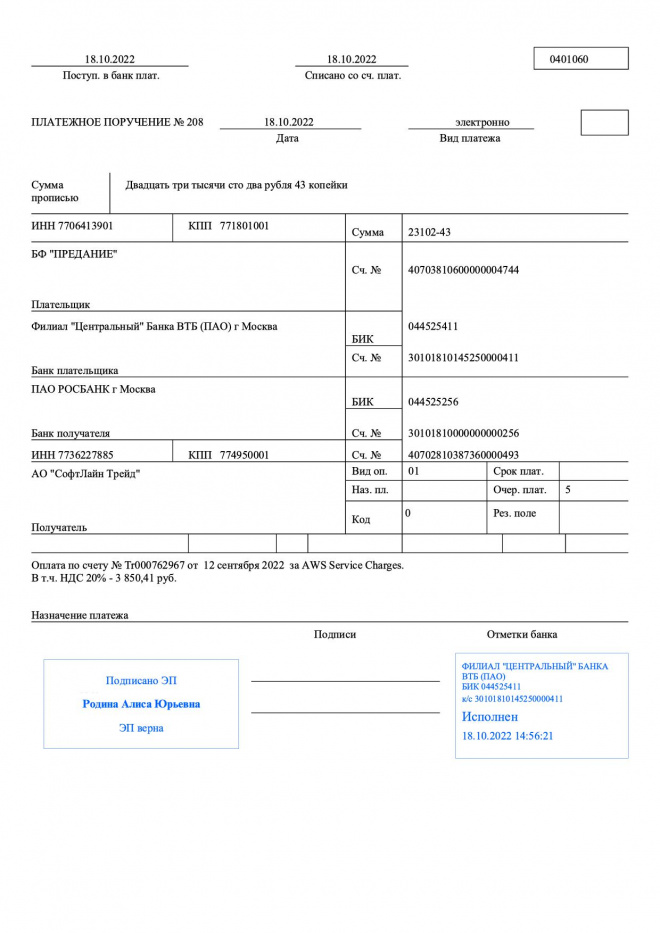 Оплачен счет за размещение видеоматериалов в "облачном сервисе" в сентябре 2022 г.
