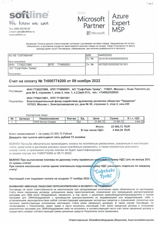 Оплачен счет за размещение видеоматериалов в "облачном сервисе" в октябре 2022 г.