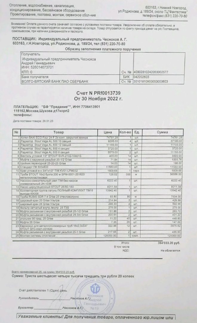 Оплачена покупка стройматериалов, необходимых для устройства отопления в доме семьи Кузиных