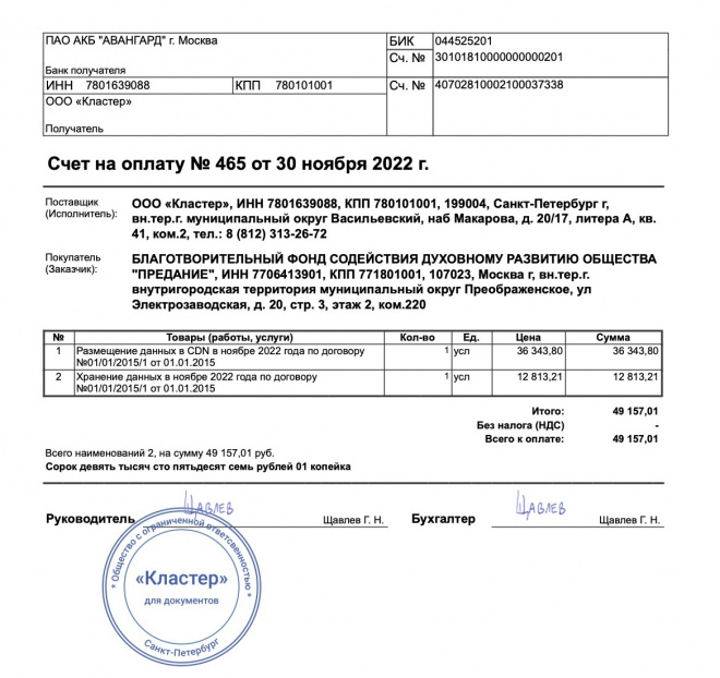 Оплачен счет за размещение материалов медиатеки в "облачном сервисе" в ноябре 2022 г.
