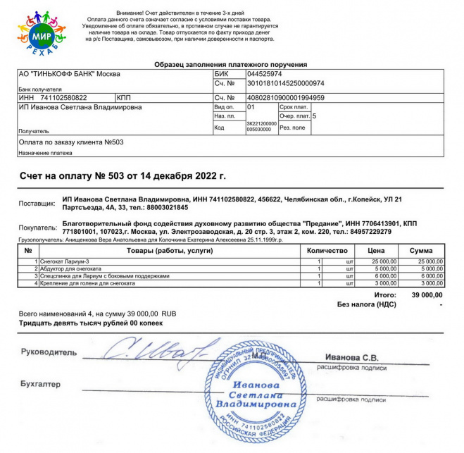 Пожертвование согласно ст.582 ГК РФ. Без налога (НДС)