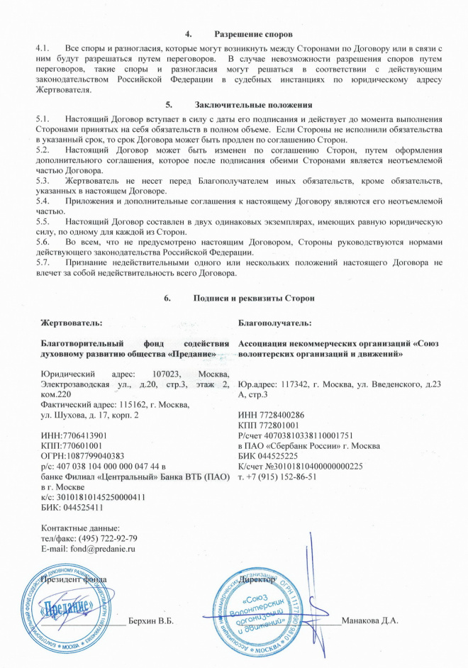 По договору пожертвования переведены средства на оплату коммунальных и эксплуатационных расходов по содержанию и эксплуатации помещения Союза добровольческих организаций и движений
