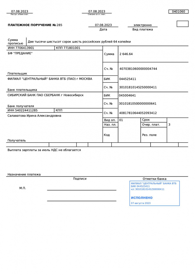 Перечисление заработной платы и отпускных сотрудникам за июль 2023 г.