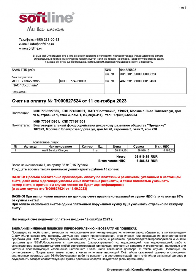 Оплачен счет за размещение видеоматериалов в "облачном сервисе" в сентябре 2023 г.