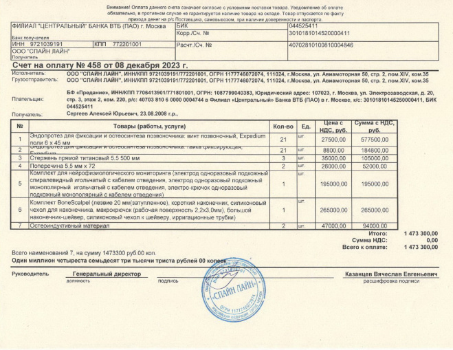 Оплачен счет за конструкцию, необходимую для проведения операции по коррекции позвоночника Алёше Сергееву